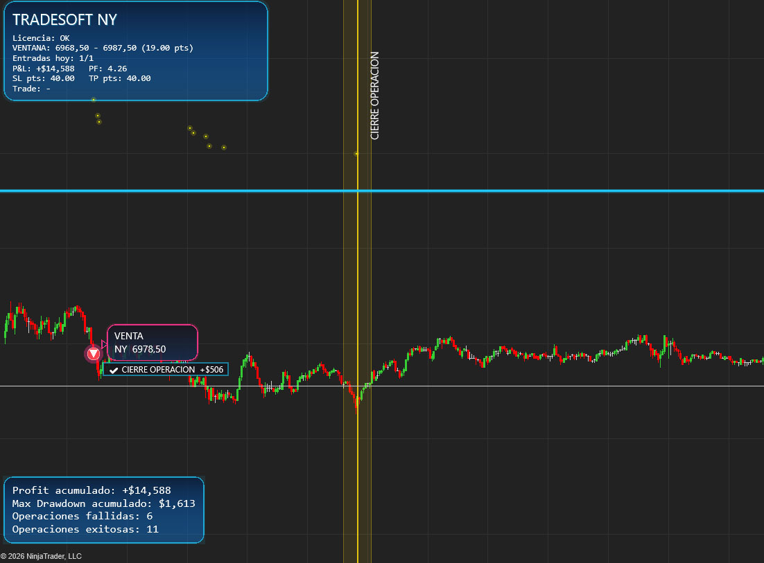TSNY takes one trade per day, and positions are closed no later than 2:25 PM ET (19:25 Madrid time). It is a guided execution framework (not an unattended bot): it keeps you aligned with a clear, repeatable process across the full trade.