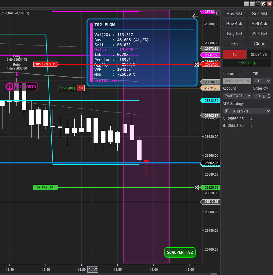If SDA is designed to let intraday trades breathe, TS Scalp prioritizes timing and precision: it enters where the market fails to accept price (absorption or failed continuation) and it exits where the market typically pays quickly: rotation back to value, a POC test, or an inefficiency close. This is a natural fit for US session activity on markets like ES, NQ, YM, RTY.